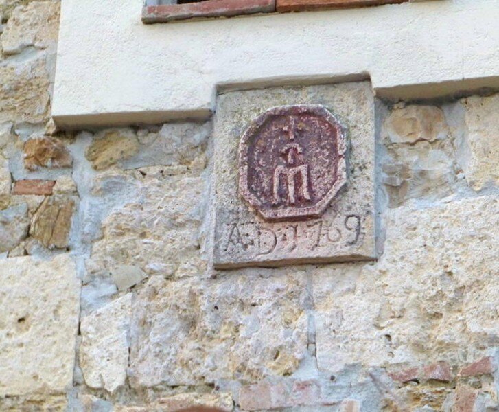 Di particolare interesse sono due formelle murate sulle facciate della casa: una è posta sopra la porta d’accesso che si apre a occidente e reca l’emblema della Misericordia con indicato l’anno di costruzione dell’edificio; l’altra è sulla parete nord, con le iscrizioni: A.(nno) D.(omini) 1769, A.D. 1929, R.(estaurato) ANNO VII (Era fascista).