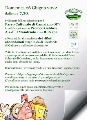 La mattina di domenica 26 giugno 2022, i volontari dell’Associazione per il Parco Culturale di Camaiano ODV, in collaborazione con la Proloco Gabbro e con REA Spa, hanno effettuato la ripulitura dai rifiuti abbandonati della zona di Bucafonda, a Gabbro (Rosignano M.mo).Andando dal parcheggio pubblico di Via delle Capanne al campo sportivo e di lì verso il Botro Sanguigna, nel raggio di 150 metri è stata raccolta una quantità enorme di rifiuti di ogni genere, dalle solite bottiglie di plastica, vetro e lattine a degli elettrodomestici, mobili, sanitari, gabbioni e tanti altri oggetti, buttati lungo la strada e nel bosco adiacente.