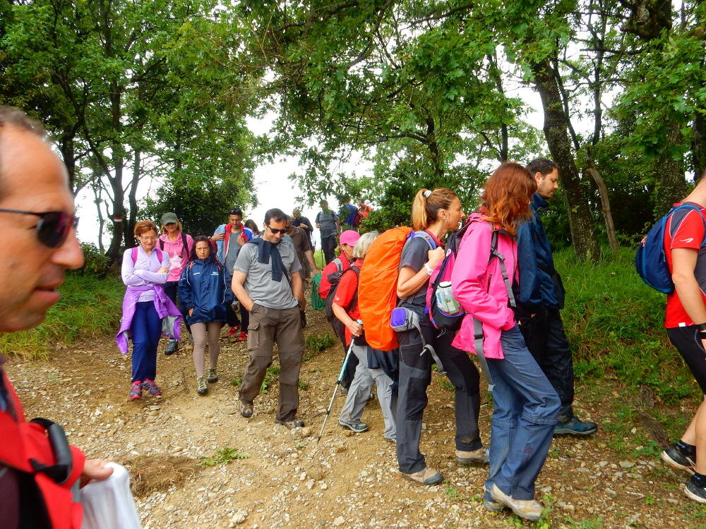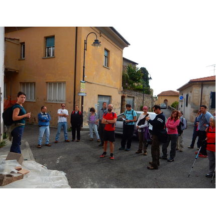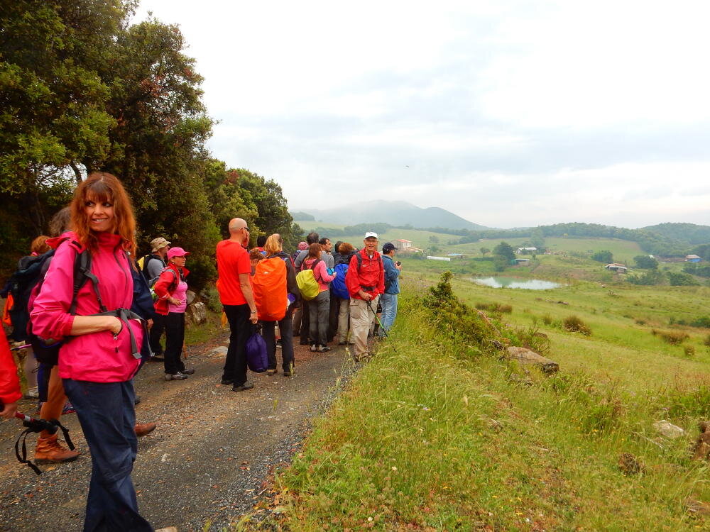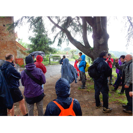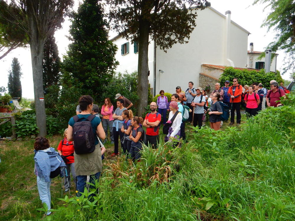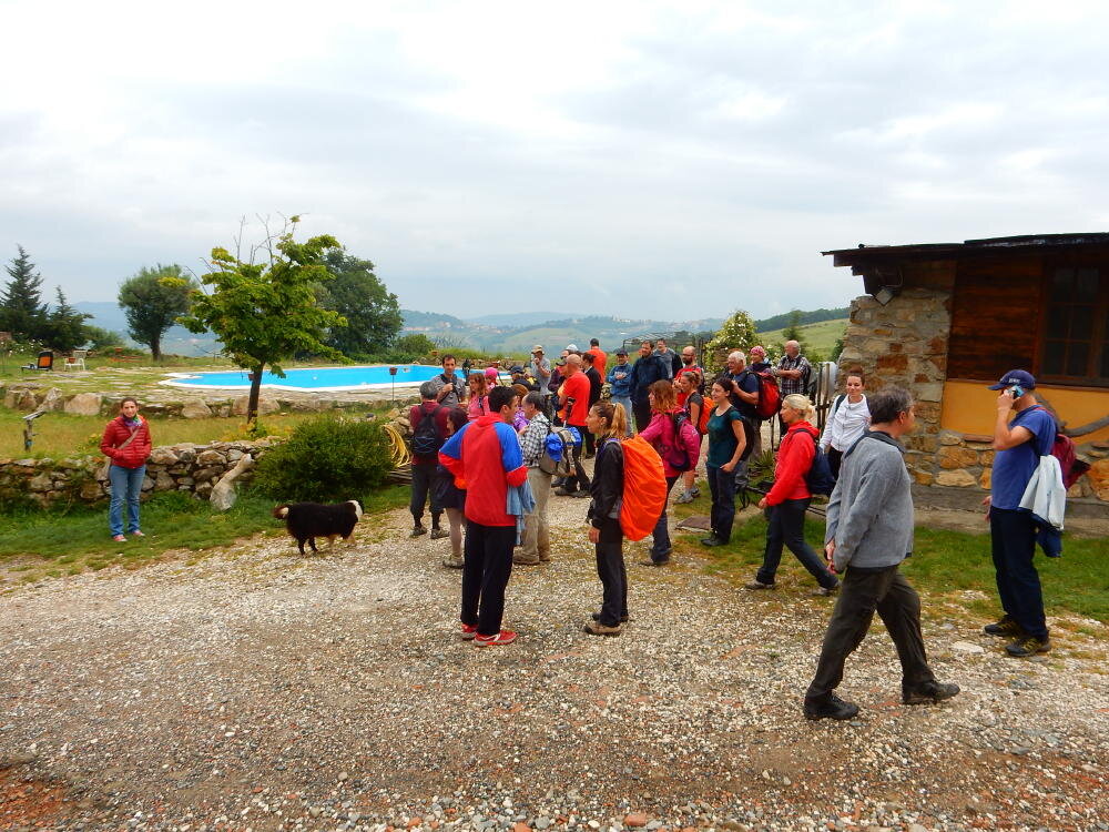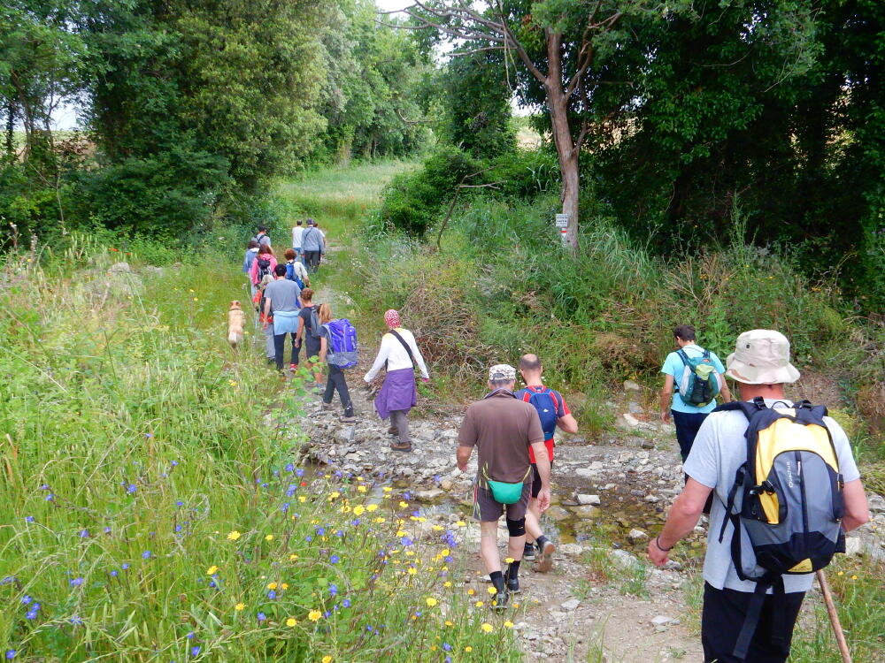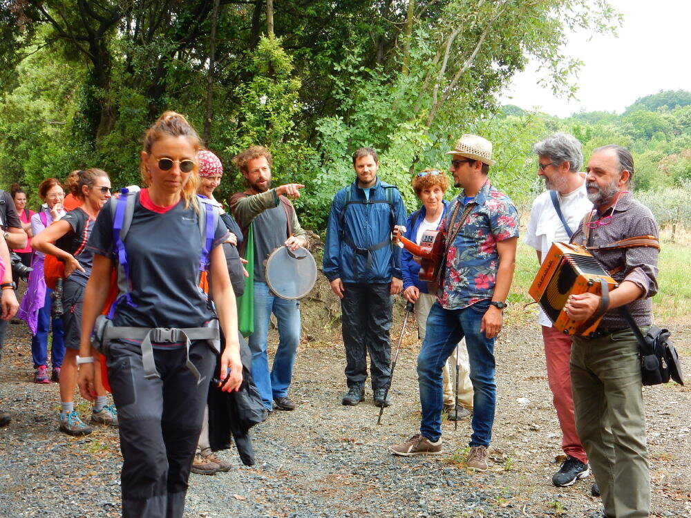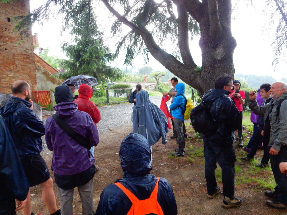 Nonostante le pessime previsoni meteo, quasi 40 partecipanti hanno intrapreso il cammino lungo i sentieri del Parco Culturale di Camaiano, scendendo dapprima verso la valle del Riardo lungo la Strada del Mille (sentiero 199). Dopo il guado del botro Scaforno è iniziato la preannunciata pioggia ma nessuno si è perso d'animo; dopo aver lasciato il 199 è iniziata la salita lungo il percorso "Ponte Romano - Monte Carvoli" passando dalla Fattoria di Paltratico e da Villa Forti fino ad arrivare a Piazza Mattiola. Attraversata la via del Vaiolo, il gruppo degli intrepidi pastori bagnati si è diretto a Pian dei Lupi dove si trova l'omonima azienda che alleva pecore e capre e produce dell'ottimo formaggio; alcuni dei partecipanti hanno colto l'occasione di acquistarne qualche forma. Giunti infine al Laghetto delle Serre al Monte Pelato, dopo una piccola pausa per fare la consueta fotografia di gruppo, è stata imboccata l'estremità sud della Strada del Mille che riconduce fino a Castelnuovo della Misericordia lungo l'antica mulattiera del Poggio Terra Rossa, ripulita il giorno precedente proprio per questa occasione. Poco prima di arrivare in paese, il gruppo è stato accolto a sorpresa dall'allegra musica dei cantamaggio.