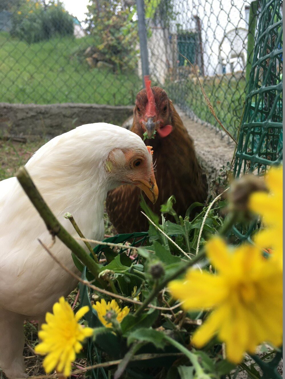 La libertà. I primi mesi non le abbiamo fatto uscire dal loro recinto per la paura che si allontanassero troppo: il terreno è vasto e spesso vi entrano animali selvatici e cani vaganti; inoltre non ci sono recinzioni tali da impedire a delle vispe galline di arrivare ovunque decidano di andare, anche sulla strada.