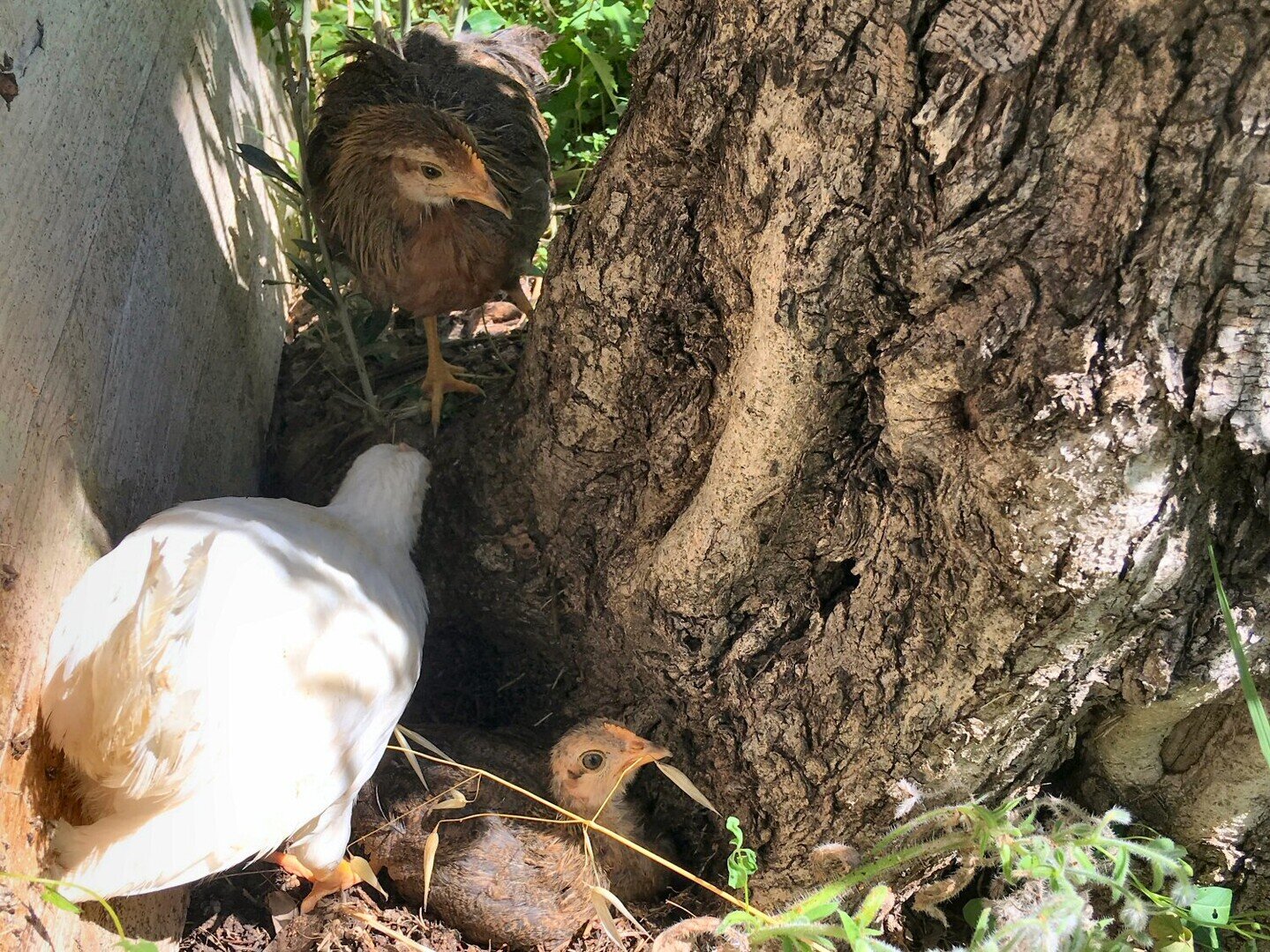 inizialmente non si fidavano a uscire ma presto la curiosità ha preso il sopravvento. E' stato emozionante vedere la loro felicità nel poter esplorere i dintorni, razzolare in tanti posto nuovi e fare meravigliosi bagni di terra! Nel tempo le abbiamo abituate ad uscire ogni pomeriggio - ingegnandoci a limitare i loro spostamenti troppo audaci - e la sera loro rientrano puntualmente prima di buio per andare a dormire sul loro ulivo.