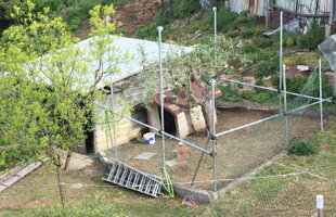 Costruire il pollaio è stato tutt’altro che facile: abbiamo adattato un pollaio vecchio in disuso da anni e come spesso succede, quel lavoro è risultato più complesso che farne uno ex nuovo. Un bel ulivo al centro del pollaio ci ha costretto di fare un’intelaiatura alta più di 4 metri e coprire il tutto con la rete metallica a maglia fitta è stato piuttosto complicato.