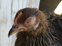 L'occhio di Nana. Poi anche la Nana ha avuto sfortuna: a settembre un forasacco (spiga di graminacea) le è entrato nell'occhio sinistro perforando la cornea! Dopo diverse settimane di terapia e tanta pazienza (non è per niente facile convincere una pollastrella a farsi mettere dei colliri più volte al giorno!) l'occhio si è salvato ma una grossa cicatrice esuberante l'ha resa cieca da quella parte. Comunque lei non se ne cura e fa una vita attivissima come se niente fosse.