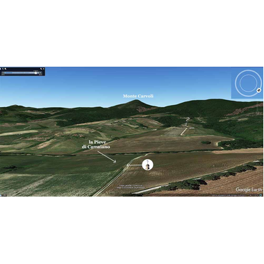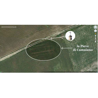 Questo giovane studioso aveva fatto una scoperta che ci lasciò di stucco: "viaggiando" su Google Earth sopra l'area della Pieve aveva notato un'anomalia nella crescita del manto erboso, proprio adiacente alla croce che avevamo eretto. Si trattava di una sorta di gigantesca impronta sul terreno la cui forma era compatibile con quella dell'antica Pieve! L'immagine è ben visibile nelle fotografie satellitari di aprile 2021 (sovrascritta l'anno dopo ma sempre presente nello storico di Google Earth), è stata (ed è) alla portata di tutti, ma solo l'occhio curioso ed esperto del dott. Pagliani lo aveva notato cogliendone il significato.